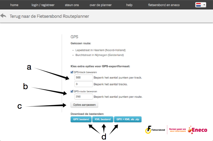 Zodra je een route hebt gepland, verschijnen in de linkerkolom vier knoppen: print, GPS, bewaar, deel. Klik op de knop GPS. Er verschijnt een pagina met GPS-instellingen.